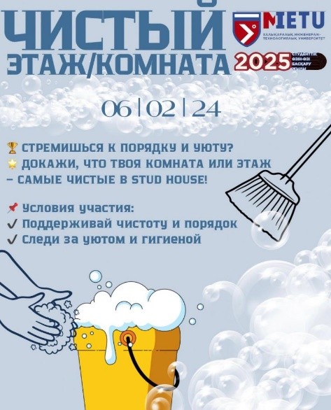 Чистота и порядок — залог хорошего настроения! В нашем общежитии мы проводим конкурс на звание "Самый чистый этаж" и "Самая чистая комната". Этот конкурс — отличная мотивация для всех студентов поддерживать чистоту и уют в своих жилых помещениях. Участники продемонстрируют свои усилия в поддержании идеального порядка: от аккуратности в комнате до организации общего пространства на этаже. Победители получат не только заслуженную награду, но и признание всего студенческого сообщества. Кто же будет в этот раз на пьедестале чистоты?