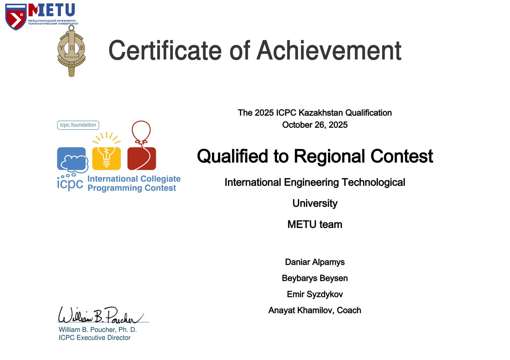 Международный инженерно-технологический университет с гордостью сообщает, что команда студентов кафедры «Программная инженерия» успешно прошла в четвертьфинальный этап Международной студенческой олимпиады по программированию ICPC Kazakhstan Qualification 2025, заняв 43-е место среди 274 команд по итогам отборочного тура.