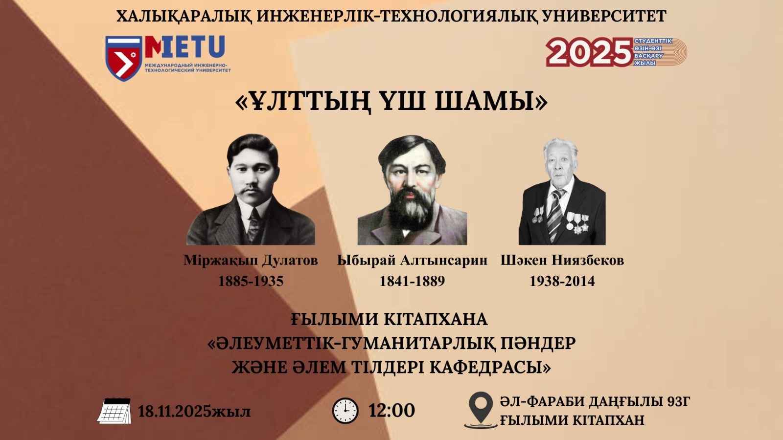 В научной библиотеке МИТУ был организован поучительный круглый стол «три свечи нации». Цель собрания-популяризация наследия просветителей, внесших неоценимый вклад в духовное развитие казахского народа, ознакомление студентов со значимостью их жизненного пути и труда.В ходе круглого стола были представлены содержательные данные о трех великих личностях: Миржакипе Дулатове (1885-1935), Ибрае Алтынсарине (1841-1889) и Шакене Ниязбекове (1938-2014). Участники поделились своими впечатлениями о деятельности, просветительском и культурном наследии, которые они сделали для нации.Студенты и преподаватели обсудили исторические сведения из жизни великих деятелей, отметили значение их труда для современного поколения, в конце мероприятия участникам были презентованы книги и материалы для просветителей из фондов библиотеки, организован свободный обмен мнениями.