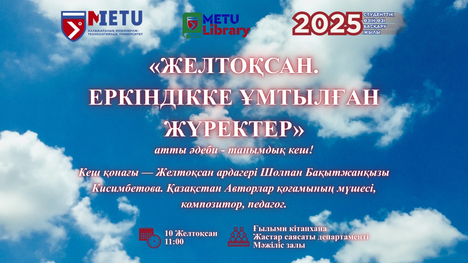 В МИТУ, в преддверии Дня независимости, состоялся литературно-познавательный вечер «Декабрь. Сердца, стремящиеся к свободе».  Цель мероприятия-глубокое разъяснение молодежи исторического значения Декабрьских событий 1986 года, популяризация подвига граждан, сражавшихся на пути к свободе, передача истинной картины того периода сегодняшнему поколению.Почетным гостем вечера является ветеран Декабрьских событий, член казахстанского общества авторов, композитор и педагог Кизымбетова Шолпан Бакытжановна. Он трогательно передал через свои воспоминания радость и печаль тех конструктивных моментов, пламя и энергию, патриотический дух молодежи.В ходе мероприятия участники узнали об особой роли Декабрьских событий на пути к независимости страны, о самоотверженности и отваге участвовавшей в них молодежи, ознакомились с историческими данными.