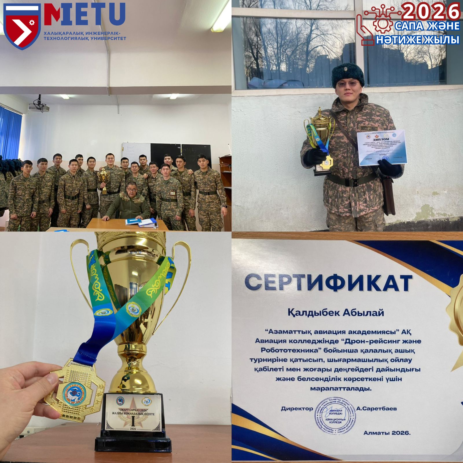 «Азаматтық авиация академиясы» АҚ Авиация колледжінің «Дрон-рейсинг және робототехника» бағыты бойынша білім алушысы, сондай-ақ Халықаралық инженерлік-технологиялық университетінің «Бағдарламалық инженерия» кафедрасының 3 курс ПИ-23-1.4к тобының студенті Қалдыбек Абылай жетекшісі Әлиасқар Мағжан Сүндетұлының қолдауымен қалалық ашық турнирге қатысып, жоғары нәтиже көрсетті.