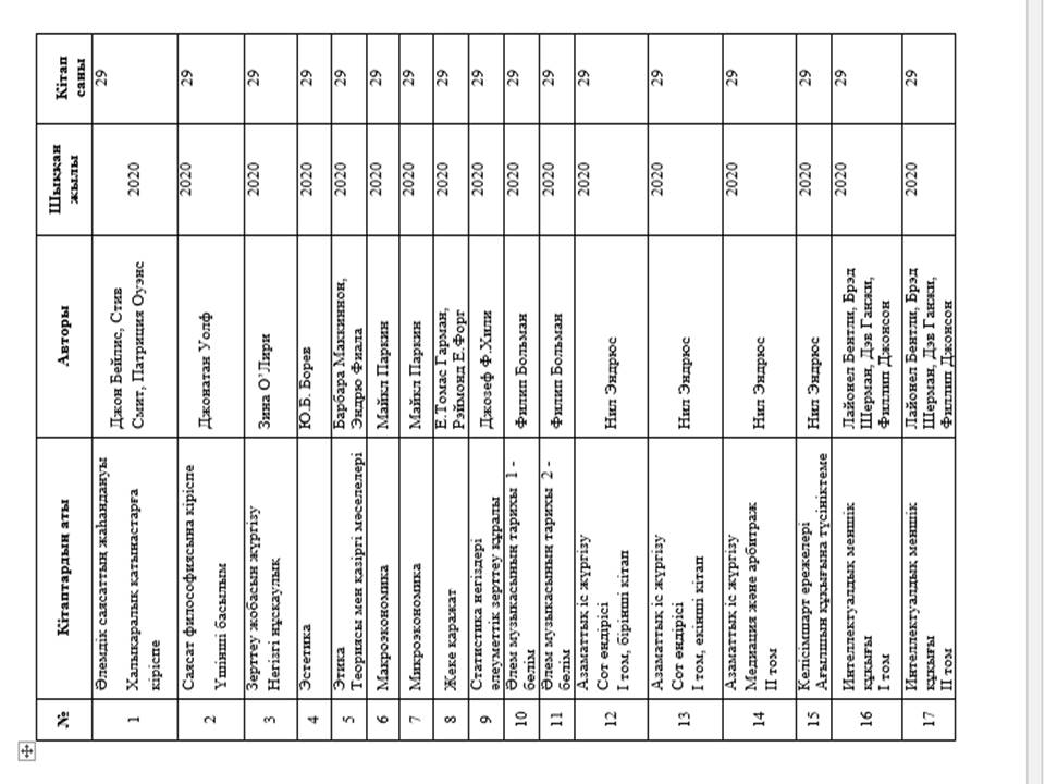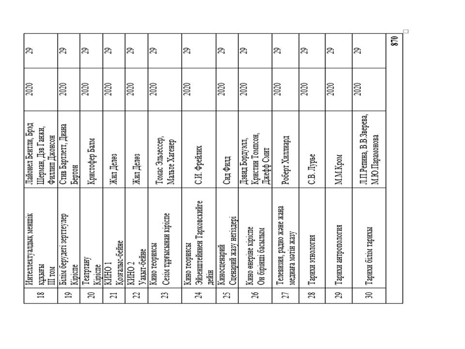 В рамках государственной программы «Рухани жаңғыру» в фонд научной библиотеки поступили книги «Новое гуманитарное образование. По проекту» 100 новых учебников на казахском языке " в количестве 65 наименований поступило 1885 экземпляров книг. В сентябре 2020 года 30 наименований пополнились книгами в количестве 870 экземпляров: