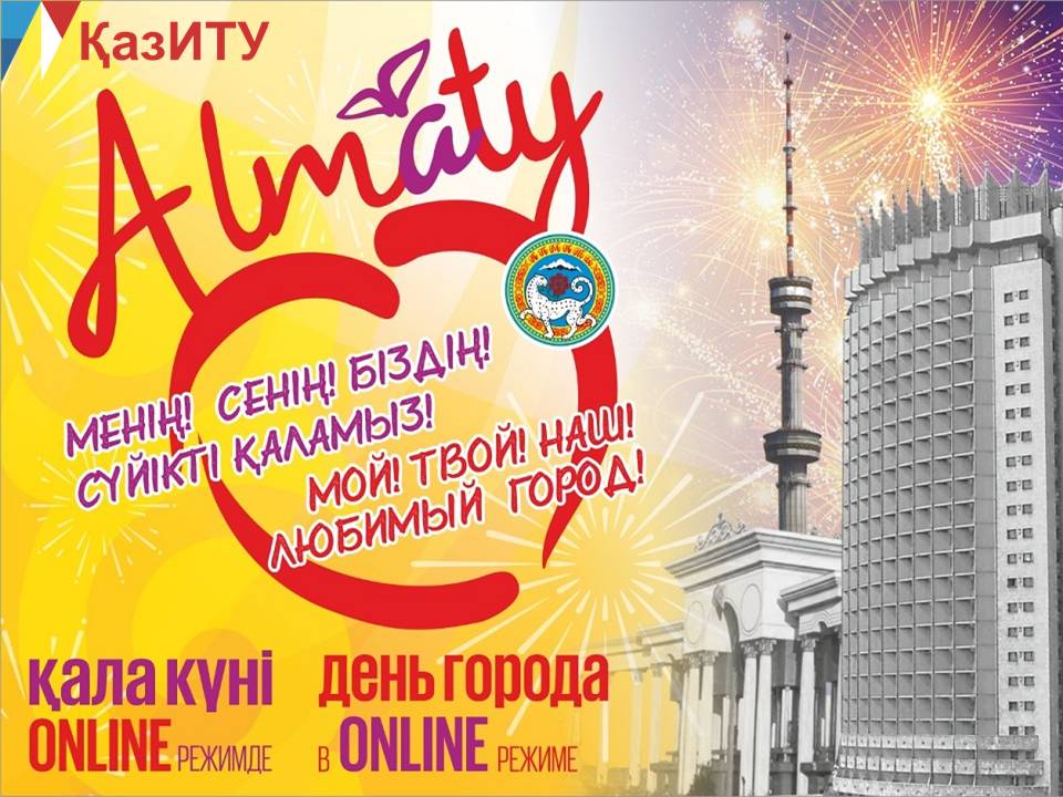 Уважаемые жители Алматы, уважаемый коллектив КазИТУ и студенты поздравляем вас с Днем города! Сегодня Алматы отмечает свой очередной день рождения. Стало традицией отмечать праздник ежегодно в третье воскресенье сентября. Однако сложившаяся ситуация не позволяет отмечать день города так, как каждый год. Но в этом году все мероприятия проходили в режиме онлайн и создавали праздничное настроение.