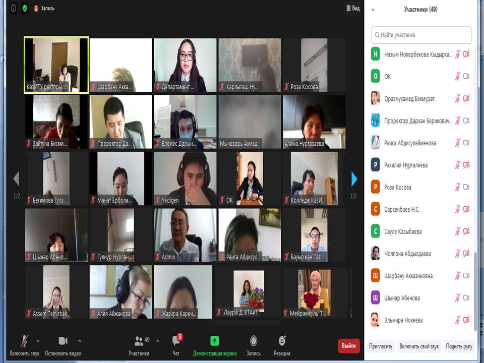 Ректор КазИТУ Гульнар Алибековна с приветственным словом открыла заседание Совета эдвайзеров, в своем выступлении она отметила эдвайзер это -педагог, который должен оказывать обучающимся наряду с учебным процессом помощь в вопросах воспитания, формировать среду, способствующую духовному развитию студентов в своей группе и пожелал успехов в работе эдвайзеров. В ходе встречи были затронуты вопросы системы дистанционного обучения, организации учебного года, принципы и цели работы эдвайзеров со студентами, организационные и коммуникативные способности при проведении эдвайзерских часов в группе, навыки оптимальной координации учебно-воспитательного материала как преподавателя. В связи с этим,в среду каждой недели был разработан график проведения эдвайзерских часов и составлен график тем, которые будут освещаться каждую неделю.