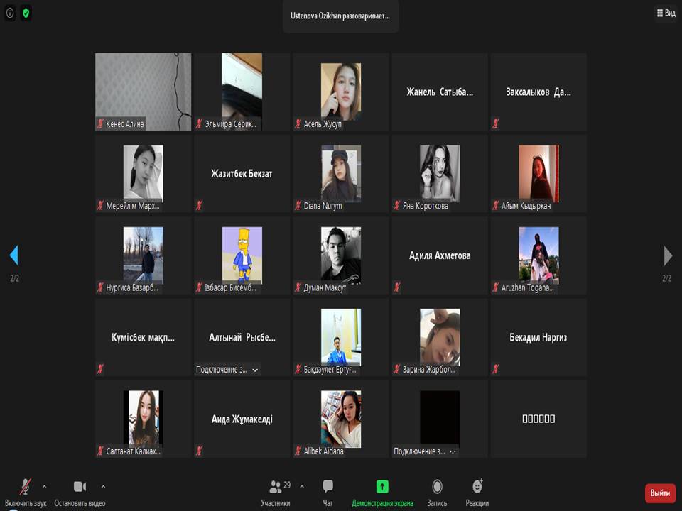 Студенты активно участвовали в интересной онлайн встрече и задавали свои вопросы. Многие вопросы касались туризма за рубежом и условий, учитываемых в путешествиях в другие страны. Озихан Жанысбековна подробно ответила на вопросы студентов и поделилась своими советами. Благодарим Устенову Озихан Жанысбековну за то, что она уделила особое время студентам, провела полезный и интересный лекций!