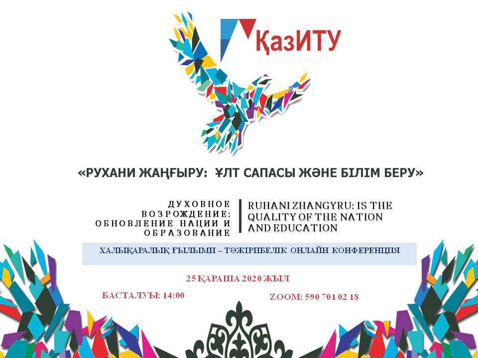 25 ноября 2020 года в Казахстанском инженерно-технологическом университете пройдет международная научно-практическая конференция «Духовное возрождение: обновление нации и образование» с участием учёных, магистров, студентов, руководителей школ, колледжей и учащихся.