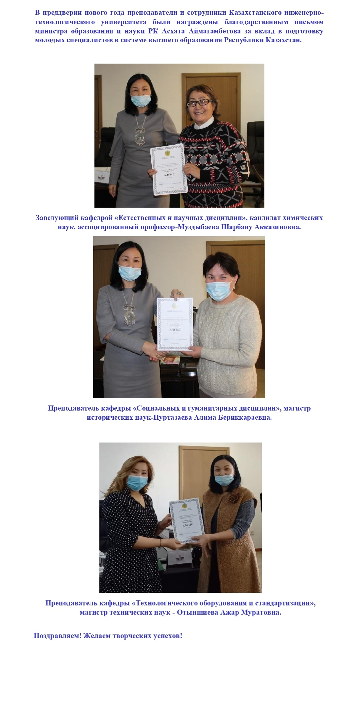 Преподаватели КазИТУ награждены благодарственным письмом министра образования и науки РК