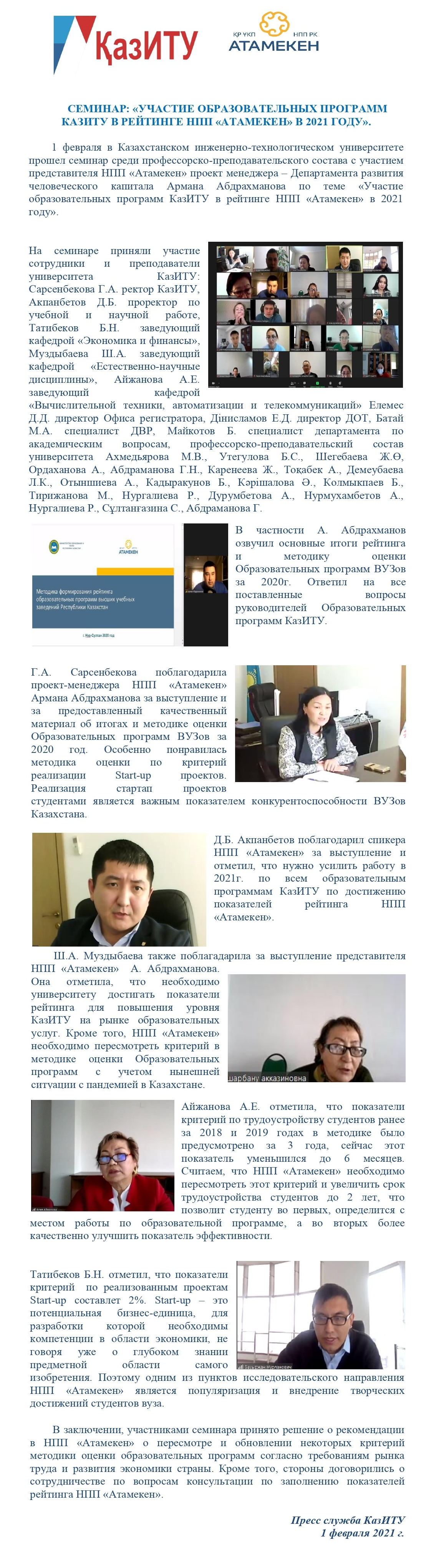 СЕМИНАР: «УЧАСТИЕ ОБРАЗОВАТЕЛЬНЫХ ПРОГРАММ КАЗИТУ В РЕЙТИНГЕ НПП «АТАМЕКЕН» В 2021 ГОДУ».