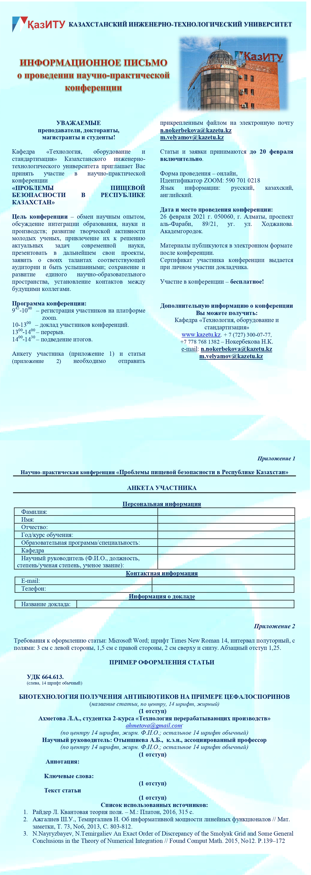 Научно-практическая конференция: «ПРОБЛЕМЫ ПИЩЕВОЙ БЕЗОПАСНОСТИ В РЕСПУБЛИКЕ КАЗАХСТАН»