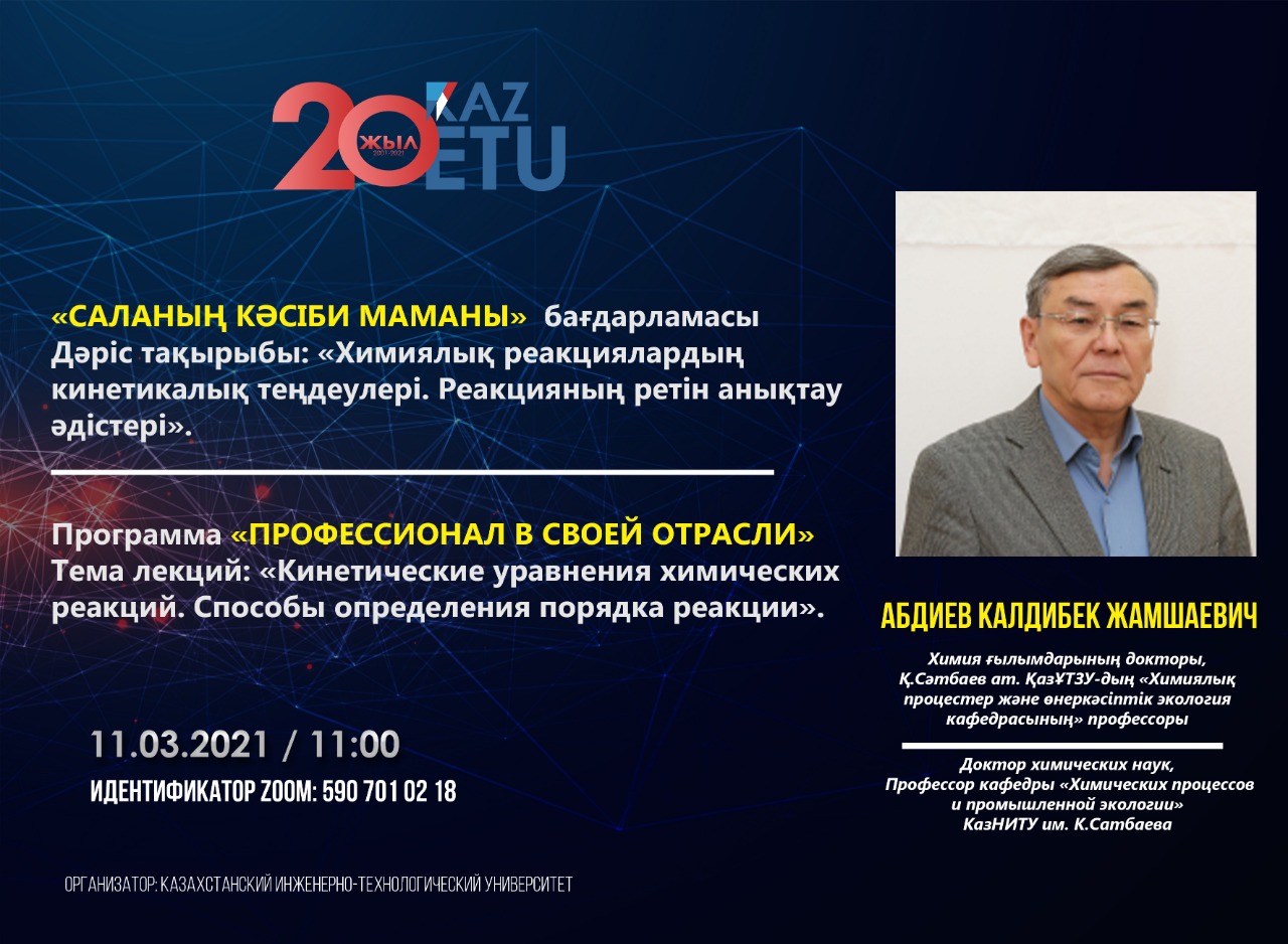 В рамках программы КазИТУ «Профессионал в ссвоей отрасли», 11.03.2021 г. прошла гостевая лекция Абдиева К.Ж., доктора химических наук, профессора Казахского Национального исследовательского технического университета имени К.Сатпаева в режиме онлайн на тему «КИНЕТИЧЕСКИЕ УРАВНЕНИЯ ХИМИЧЕСКИХ РЕАКЦИЙ. МЕТОДЫ ОПРЕДЕЛЕНИЯ ПОРЯДКА РЕАКЦИИ» для студентов и преподавателей университета.