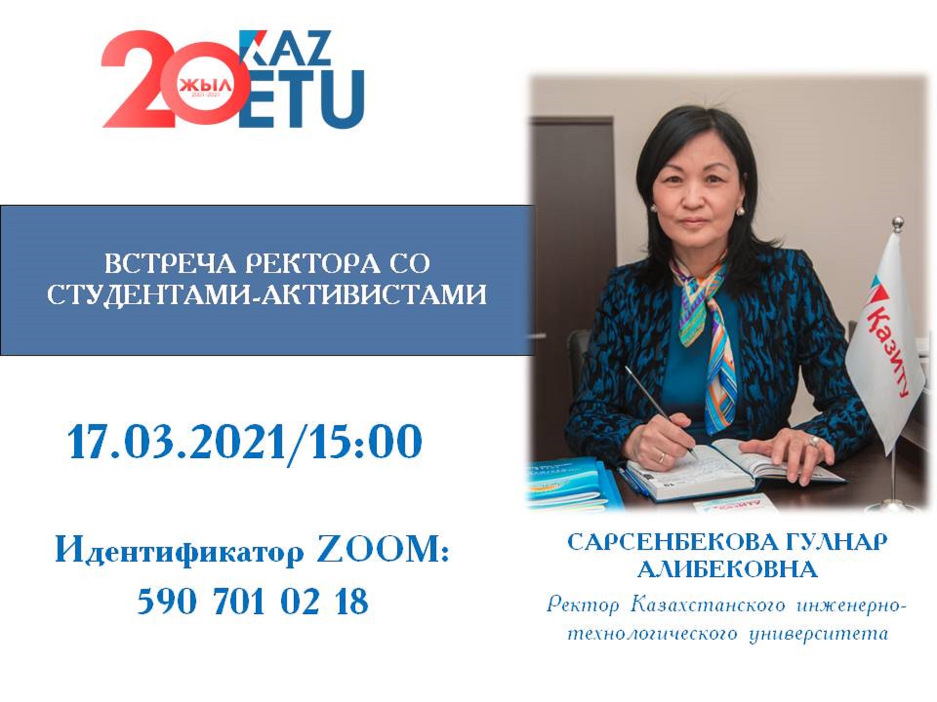 В Казахстанском инженерно-технологическом университете состоялась встреча ректора Сарсенбековой Гульнар Алибековны с активными студентами комитета молодежных организаций. Встреча прошла в онлайн и оффлайн формате с соблюдением санитарных требований. В мероприятии приняли участие как студенты, так и профессорско - преподавательский состав, руководители департаментов и эдвайзеры.