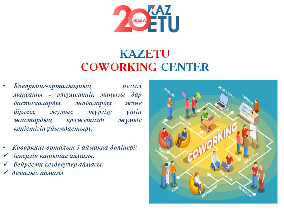 Второй частью встречи было прослушивание предложений студентов. Студент 1 курса образовательной программы «Маркетинг», обладатель знака «Алтын белгі», член комитета молодежной организации Ертуганов Бакдаулет выступил с предложением открыть в стенах университета центр "Коворкинг". Данное предложение позволило создать комфортные условия для выполнения учащимися домашних заданий во внеурочное время, в свободное время обмениваться книгами, обмениваться мнениями, играть в спортивные игры и, самое главное, тесно взаимодействовать друг с другом.