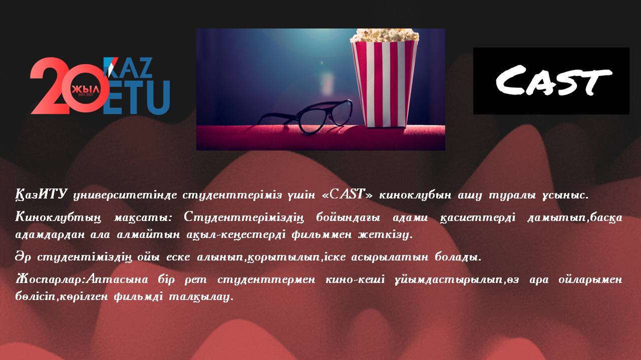 Студент 1 курса специальности «Туризм», член комитета молодежной организации-Султан Молдир рассказал о своем желании открыть курс «Мобилография» среди студентов и выразила готовность поделиться своими знаниями со студентами. В своем докладе он рассказала о проделанной работе в этой области, отметив высокий интерес среди студентов. Со стороны ректора было поручено подготовить план спецкурса. Студент 1 курса образовательной программы «Маркетинг», член комитета молодежной организации-Бисенбаев Избасар выступил с предложением открыть клуб под называнием «Cast». Цель клуба-эффективно использовать досуг студентов, вместе смотреть лучшие фильмы, новые фильмы. Задача состоит в том, чтобы студенты, осознавая происходящие в обществе события, высказывали свое мнение по увиденным произведениям и способствовали интеллектуальному развитию. Благое предложение было поддержано ректором, отметив, что в связи с нынешней пандемической ситуацией можно провести онлайн-кинопоказ на специальной платформе.