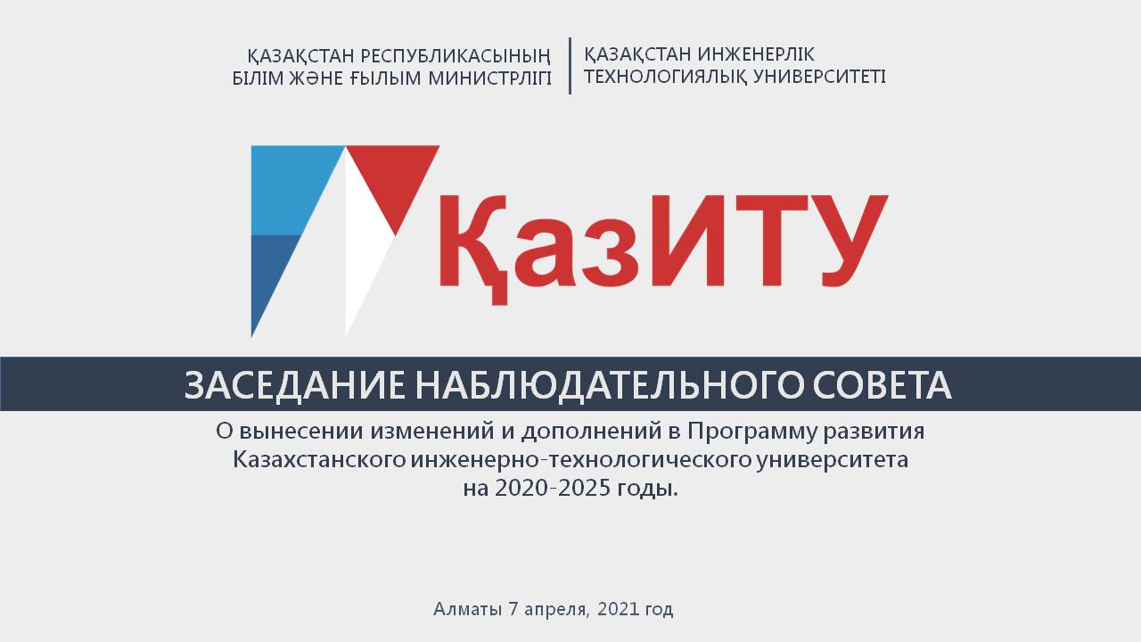 07 апреля 2021 года в Казахстанском инженерно-технологическом университете состоялось заседание наблюдательного совета. В заседании наблюдательного совета, приняли участие 11 человек, в числе которых члены совета, а также специальные эксперты и руководство университета.