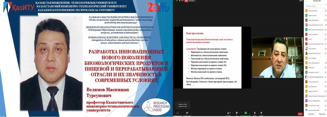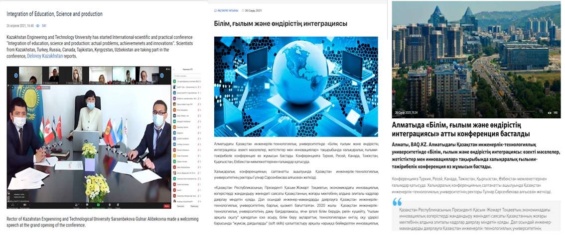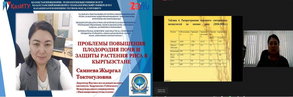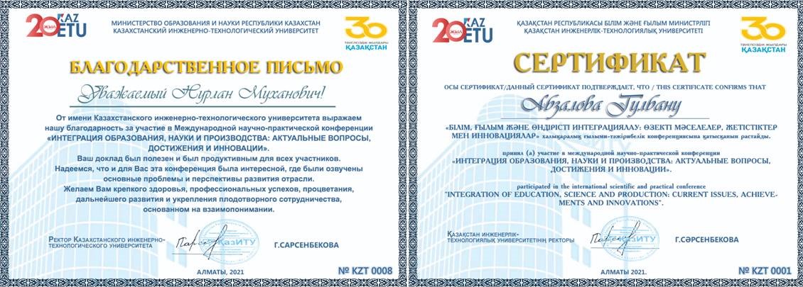 26 апреля 2021 года в Казахстанском инженерно-технологическом университете в преддверии 30-летия Независимости РК и 20-летия Казахстанского инженерно-технологического университета состоялась международная научно-практическая конференция на тему: «Интеграция образования, науки и производства: актуальные проблемы, достижения и инновации». В конференции приняли участие ученые из Турции, России, Канады, Таджикистана, Кыргызстана и Узбекистана. Ученые из разных стран обсудили интеграцию образования, науки и производства. Были освещены достижения микробиологии, состояние плодоовощеводческой отрасли страны и другие актуальные темы.