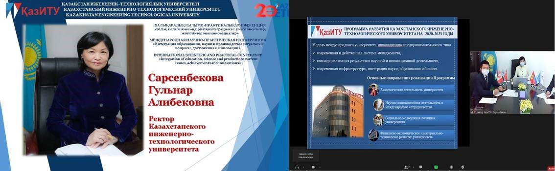 На торжественном открытии международной научно-практической конференции с приветственным словом выступила ректор Казахстанского инженерно-технологического университета Гульнар Сарсенбекова. Гульнара Сарсенбекова отметила, что политика Президента Республики Казахстан Касым-Жомарта Токаева по активизации инновационных преобразований в экономике ставит перед Высшей школой Казахстана задачу подготовки элитных кадров, именно на подготовку инженеров-специалистов направлена вся деятельность Казахстанского инженерно-технологического университета. В 2020 году принята программа развития Казахстанского инженерно-технологического университета, которая предусматривает подготовку инновационных специалистов, адаптированных к рынку, путем усиления роли фундаментального образования, реализации принципа «обучение через науку», внедрения образовательных информационных технологий, формирования «мягких навыков» (soft skills) в учебном процессе.