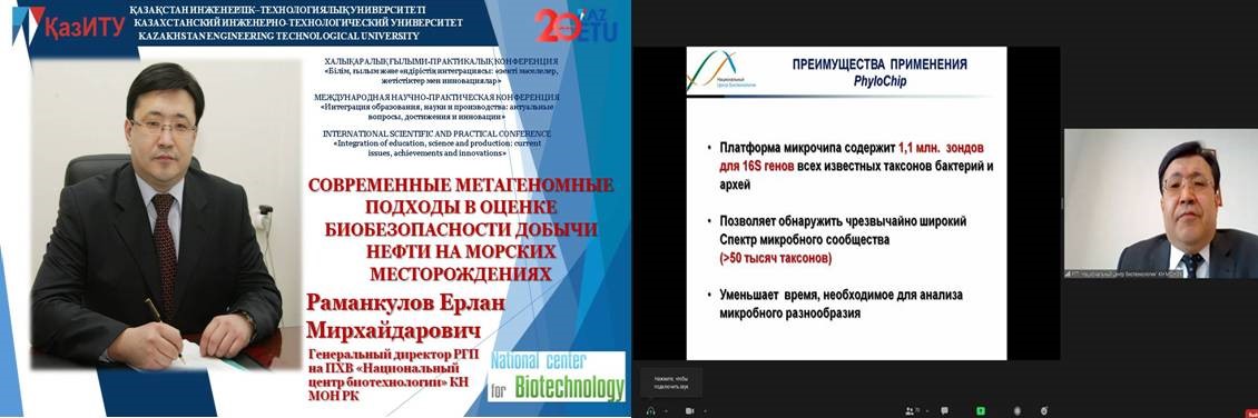 Генеральный директор РГП на ПХВ «Национальный центр биотехнологии» КН МОН РК Ерлан Раманкулов в своем докладе на тему «Современные метагеномные подходы к оценке биобезопасности добычи нефти на тенгизских месторождениях» остановился на фактах загрязнения окружающей среды при добыче нефти и опираясь на результаты исследований, проведенных Национальным центром биотехнологии, предложил перспективы применения технологии биоремедиации для решения экологических проблем.