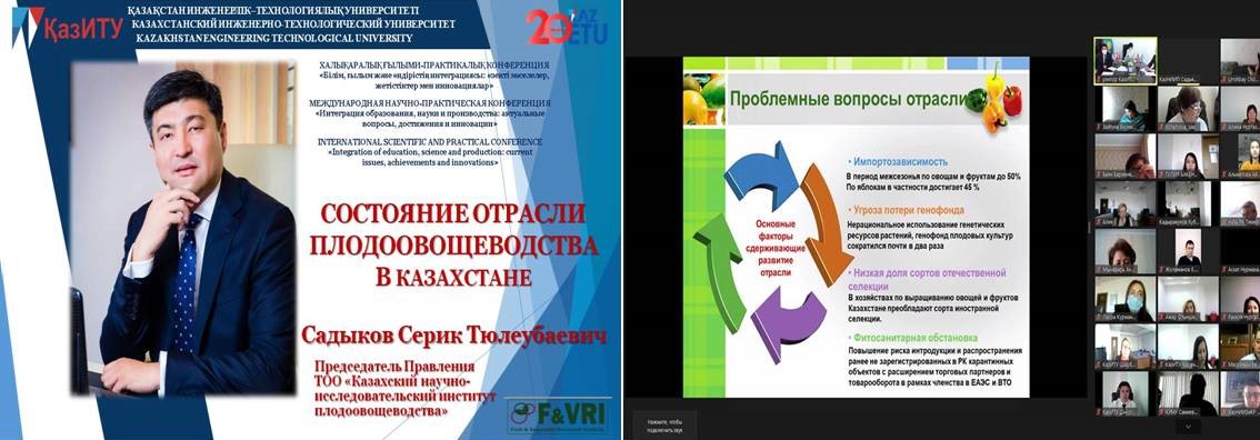 Профессор ФГАОУ ВО «Южно-Уральский государственный университет» (Национальный исследовательский университет) (Россия), заведующий кафедрой «пищевая и биотехнология» Ирина Потороко выступила с докладом на тему: «Интеграция науки и производства: инновационные технологические решения для перерабатывающих предприятий АПК». Председатель правления ТОО «Казахский научно-исследовательский плодоовощной институт» Серик Садыков в своем докладе отметил состояние плодоовощной отрасли Казахстана, количественную статистику показателей производства и потребления плодоовощной продукции населением. По его словам: Казахстан за счет собственного производства обеспечивает свои потребности в овощах, а в фруктах только на 68%. Несмотря на то, что Казахстан сам экспортирует овощи, он не может ни отказаться от импорта, и не увеличить экспорт в межсезонье.