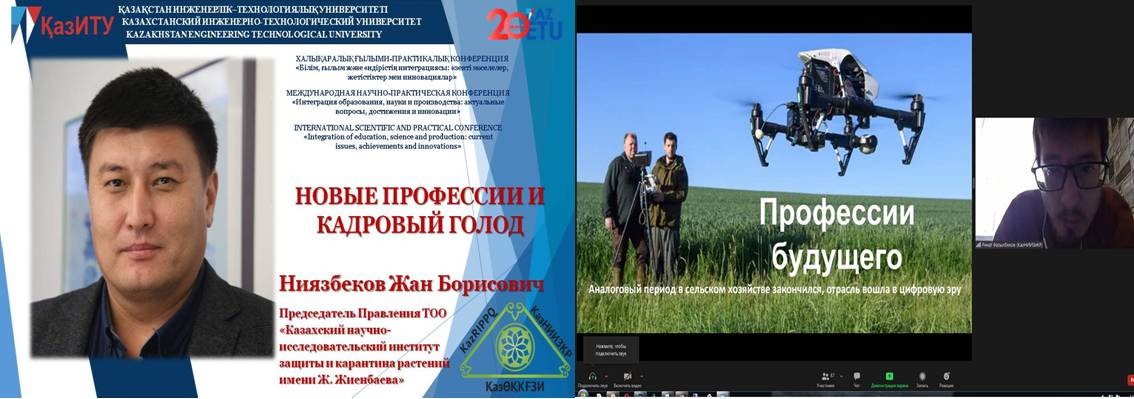 Председатель правления ТОО «Казахский научно-исследовательский институт защиты и карантина растений имени Ж. Жиенбаева» Жан Ниязбеков выступил с докладом о новых специальностях и необходимых кадрах по информатизации и автоматизации сельскохозяйственных предприятий по внедрению новых технологий в эпоху цифровизации. Говорят, что такие специальности, как Агроинформатика / Агрокибернетика, оператор автоматизированной сельскохозяйственной техники, Агроинженер, оператор беспилотных летательных аппаратов, инженер систем точного земледелия, аналитик данных Agri, Био-хакер, будут востребованы в будущем.