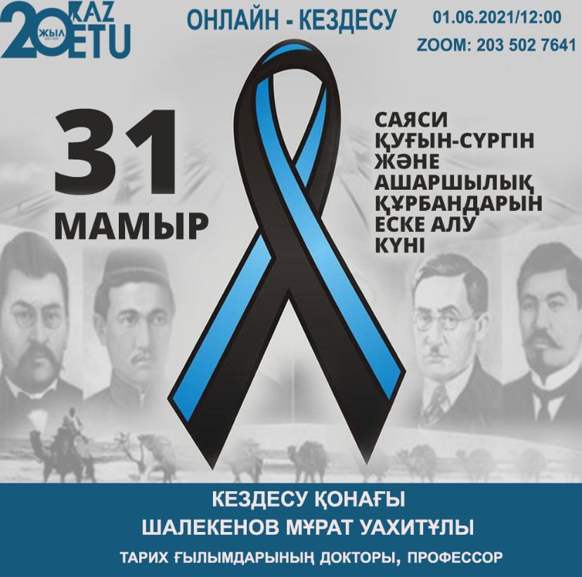 Осы орайда Қазақстан инженерлік-технологиялық университетінің «Әлеуметтік-гуманитарлық пәндер» кафедрасының ұйымдастыруымен онлайн форматта кездесу болып өтті.Кездесу қонағы әль-фараби атындағы Қазақ ұлттық университетінің «Археология, этнология және музеология» кафедрасының профессоры Шалекенов Мурат Уахитұлы қатысты. Сондай-ақ т.ғ.докторы, профессор Г.А. Сармурзина тарихи мұрағаттық деректер келтіре отырып тарихи оқиғаны толықтай ашып айтты. Осы зұлмат жылдардың азалы оқиғаларын, жазықсыз құрбан болған адамдардың есімдерін мәңгі ұмытпай, оларды әрқашан есте сақтау, өткенге салауат етіп, ақтаңдақтар ақиқатына тереңірек мән беріп, ұғыну – бүгінгі ұрпақ парызы. Өскелең ұрпақты өткеннің тағылымын үйрету, жаңа ілім-біліммен сусындатып келешекке тәрбиелеу әр толқын ұрпақтың міндеті.