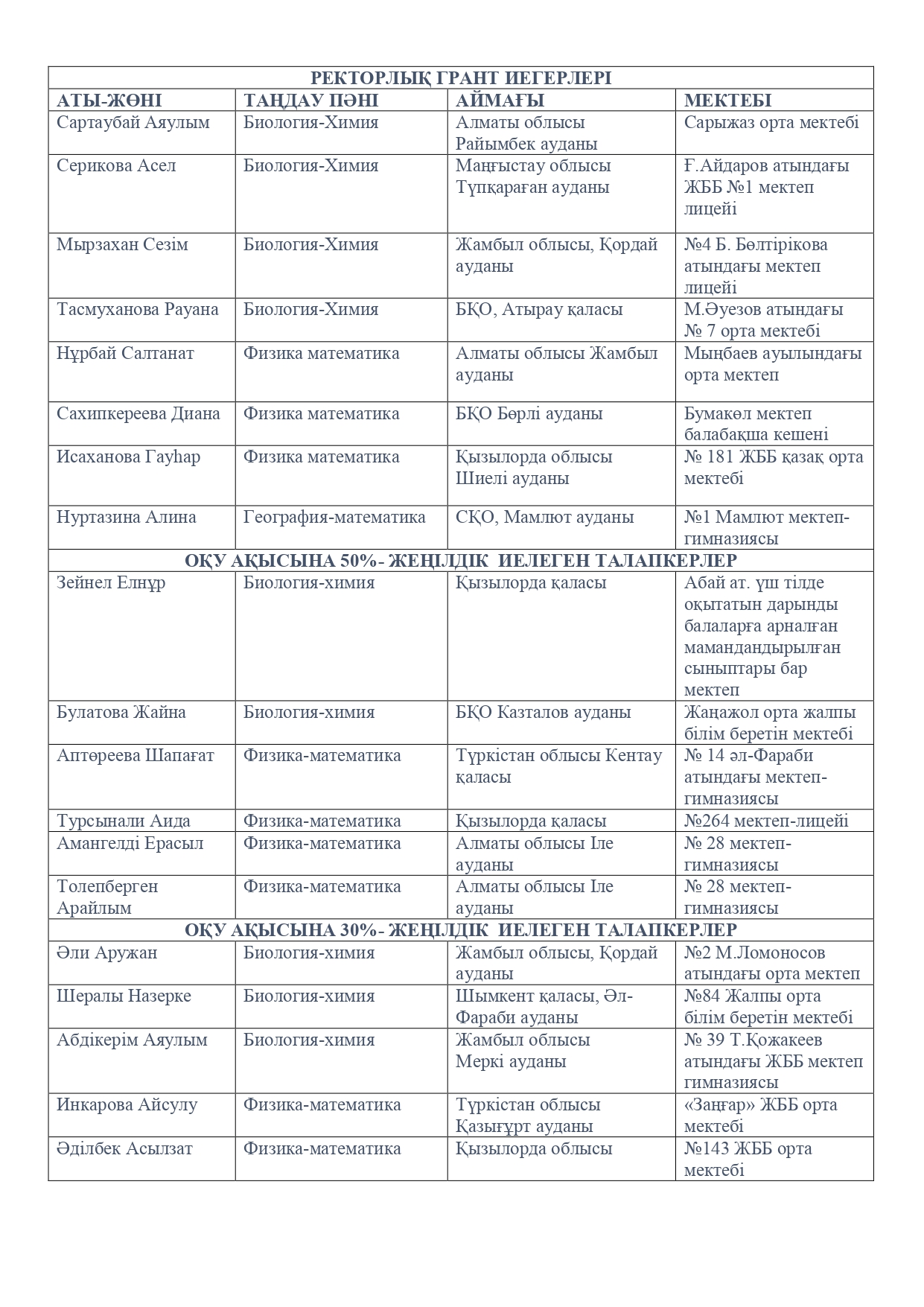 Жалпы қорытынды бойынша төмендегі талапкерлер ректорлық грантпен қатар 50%, 30%, 20% көлемінде жеңілдіктерге ие болды.