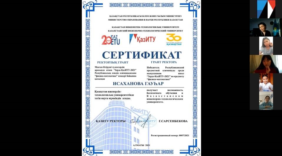 Арнайы марапаттау рәсіміне ҚазИТУ ректоры Г.Сарсенбекова қатысты. Гүлнар Әлібекқызы жеңімпаздарды жетістіктерімен құттықтап, жылы лебізін білдіріп, талапкерлерді сертификаттармен марапаттады.