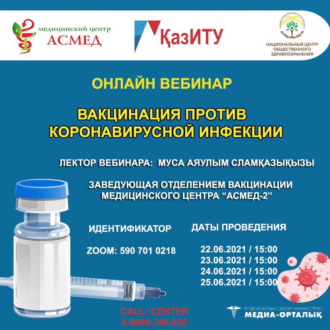 Казахстанский инженерно-технологический университет приглашает всех принять участие в вебинаре "Вакцинация против короновирусной инфекции". Лектором выступает заведующая отделением вакцинации медицинского центра “Асмед-2”- Муса Аяулым Сламқазықызы