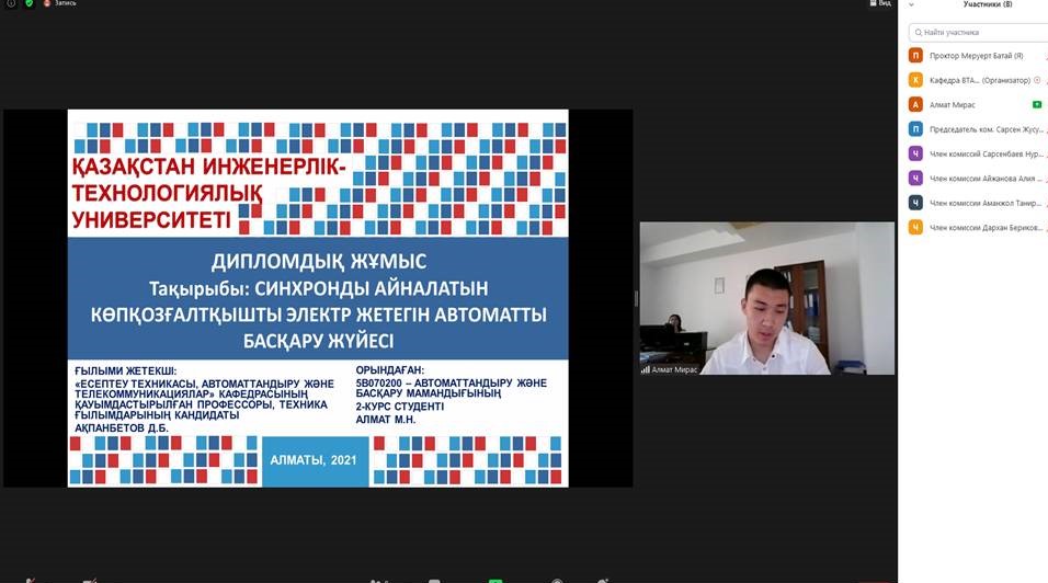 В Казахстанском инженерно-технологическом университете завершена защита выпускных дипломных работ по образовательным программам бакалавриата и магистратуры 2020-2021 учебного года. В связи с переходом учебного процесса на дистанционный формат, уже второй год проведение дипломного проектирования, в том числе индивидуальная консультация и защита научных руководителей, проходит в формате онлайн