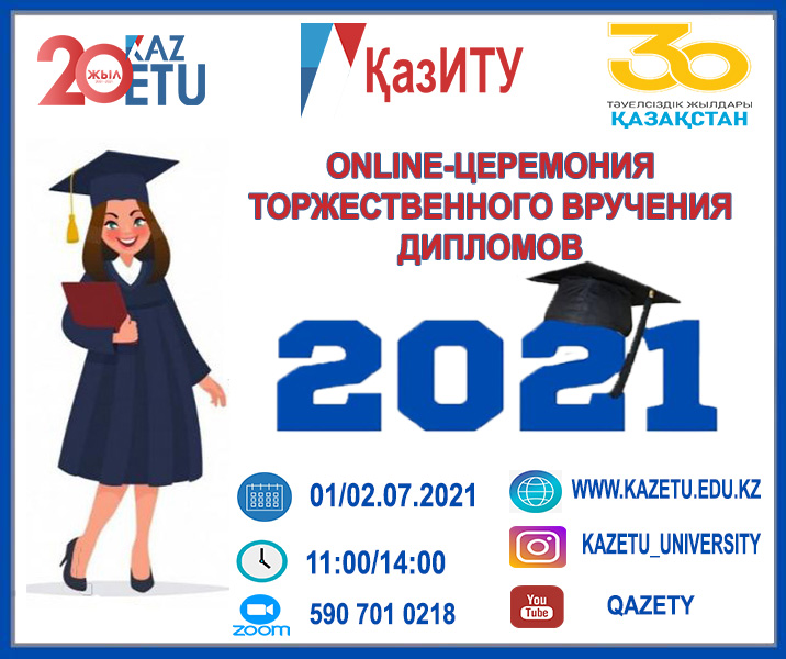 Уважаемые выпускники 2020-2021 учебного года Казахстанского инженерно-технологического университета! Поздравляем вас с успешным окончанием университета и становлением специалиста с высшим образованием!