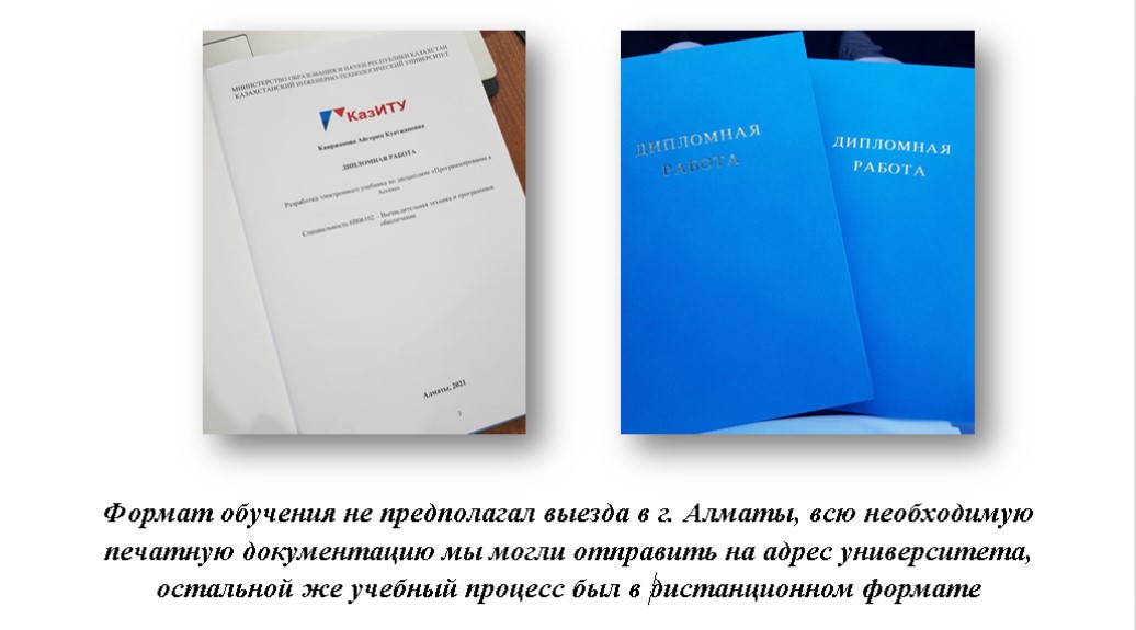 Меня зовут Айгерим Каиржанова, я выпускник специальности «Вычислительная техника и программное обеспечение». Я поздравляю с таким днем, к которому мы совместно с вами шли. Ведь сегодняшний день – это результат не одного дня, не одной недели и даже не одного года! Благодаря удобной программе и организации дистанционного обучения, КазИТУ исполнило мою мечту – получить специализацию в программировании. Уверенна, что и другим выпускникам университет дал возможность и способствовал осуществлению достижения своих целей. За что я лично от себя и от имени нашей группы выражаю благодарность руководству университета и всему профессорско-преподавательскому составу, которые решились развивать именно такой современный, своевременный и актуальный формат обучения, особенно в условиях всемирной пандемии.