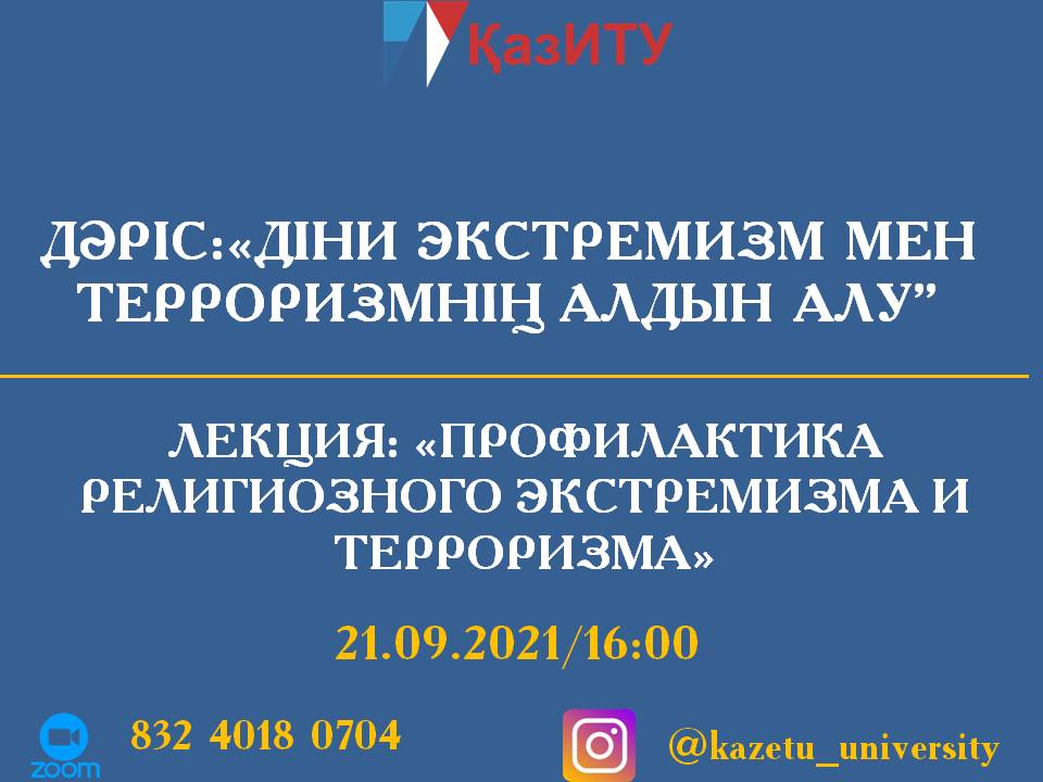 21 сентября 2021 года среди студентов Казахстанского инженерно-технологического университета была проведена лекция по профилактике религиозного экстремизма и терроризма.